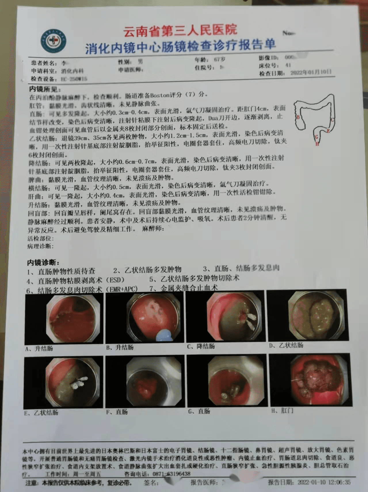 镜下所见:横结肠及乙状结肠见多发息肉,横结肠见两枚0.8*0.8cm大小息肉,粘膜下注射生理盐水后EMR切除送检,创面处理后钛夹封闭,另电凝4枚。乙状结肠见1.0*1.0cm大小息肉,粘膜下注射生理盐水后EMR切除送检,创面处理后钛夹封闭,电凝5枚。肛门内见痔核数枚,表面充血。