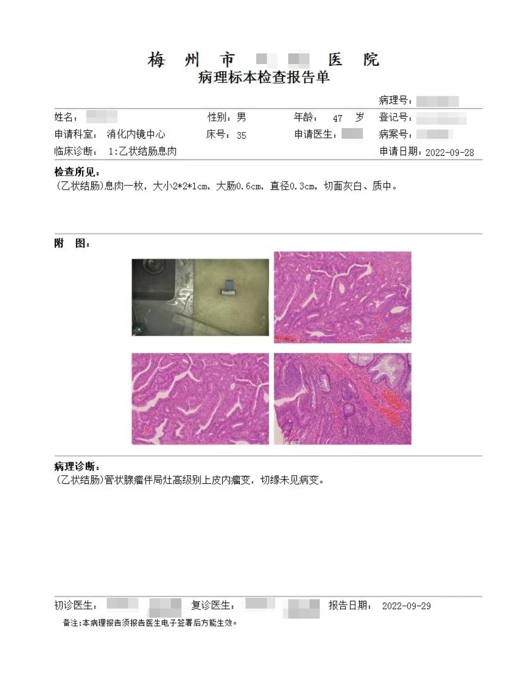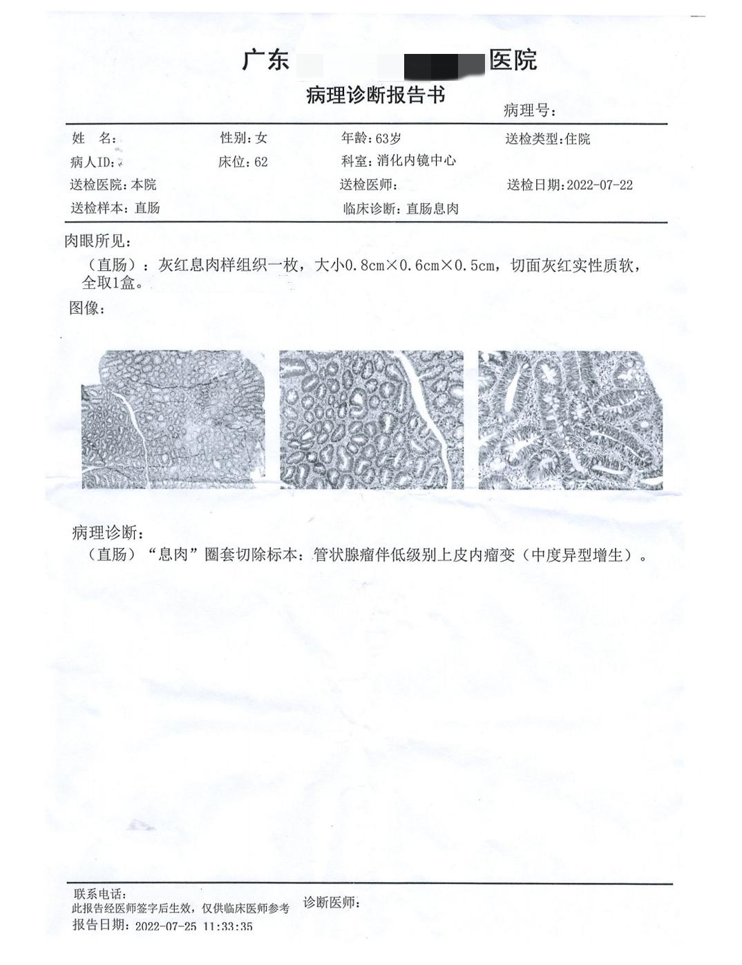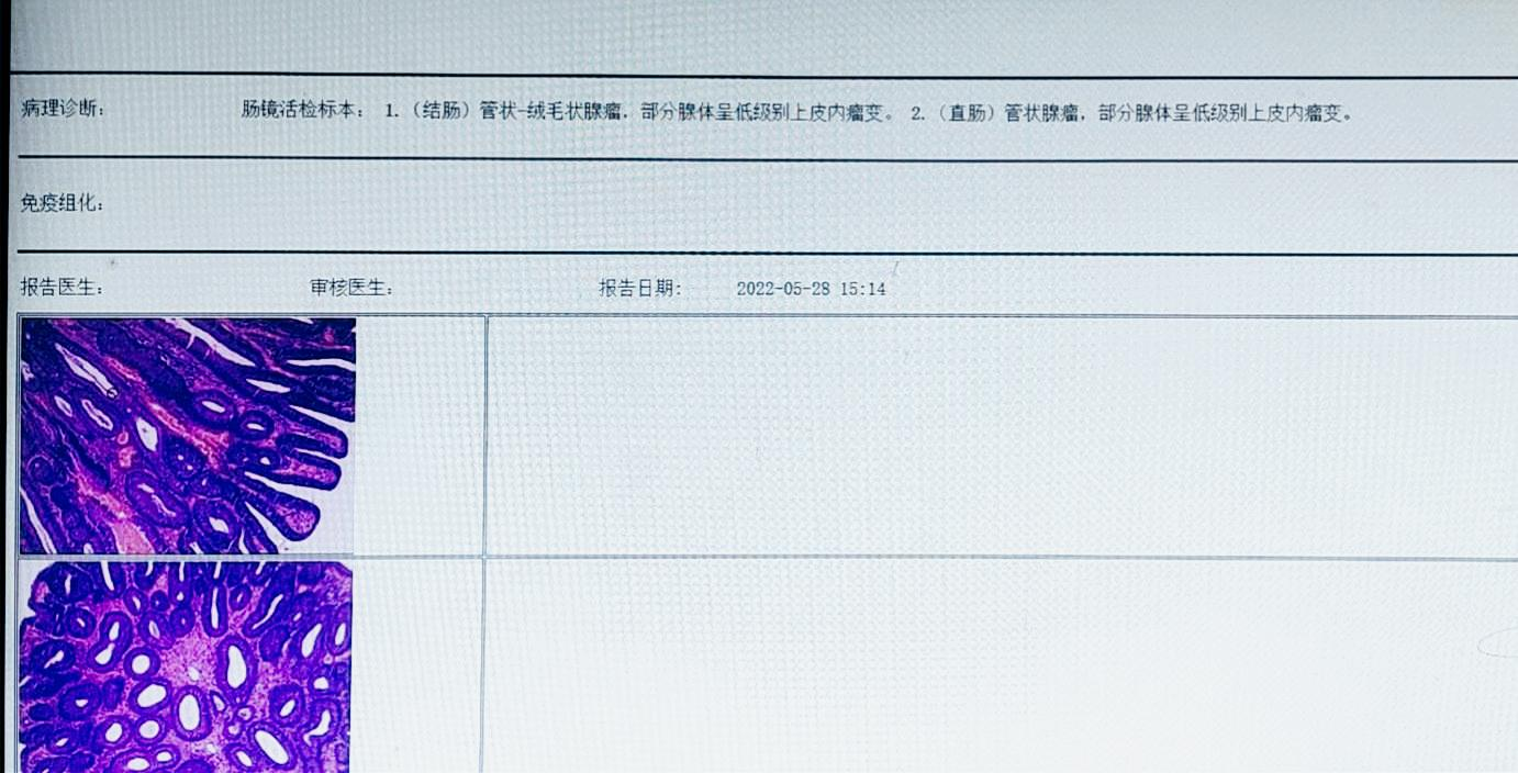1."回盲部" 示∶管状腺瘤,部分腺体低级别上皮内瘤变(轻-中度异型增生,局部中度异型增生)。