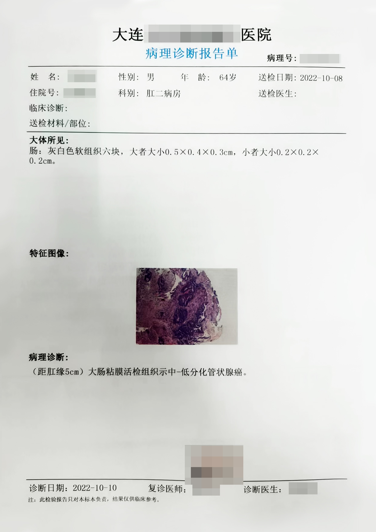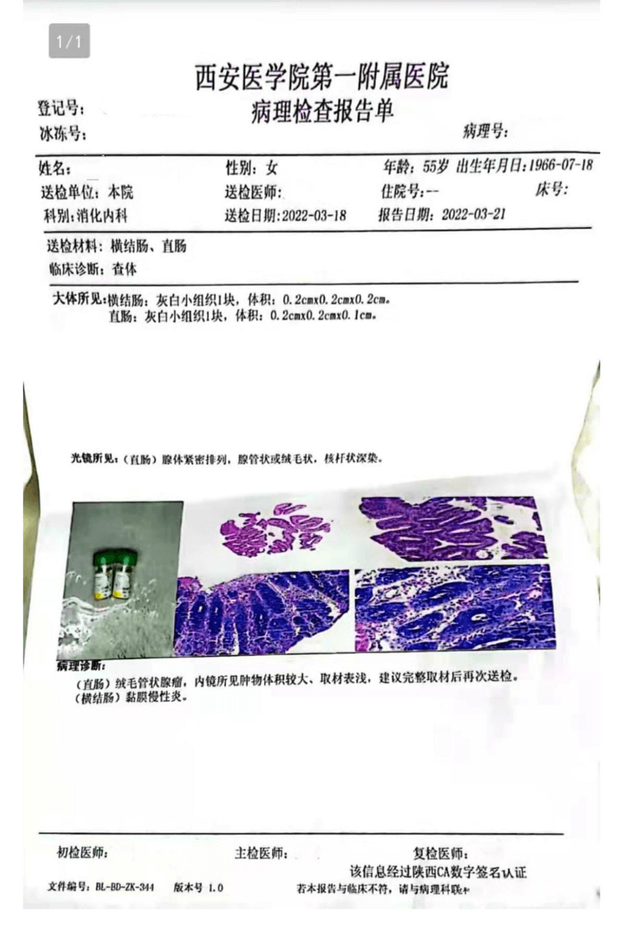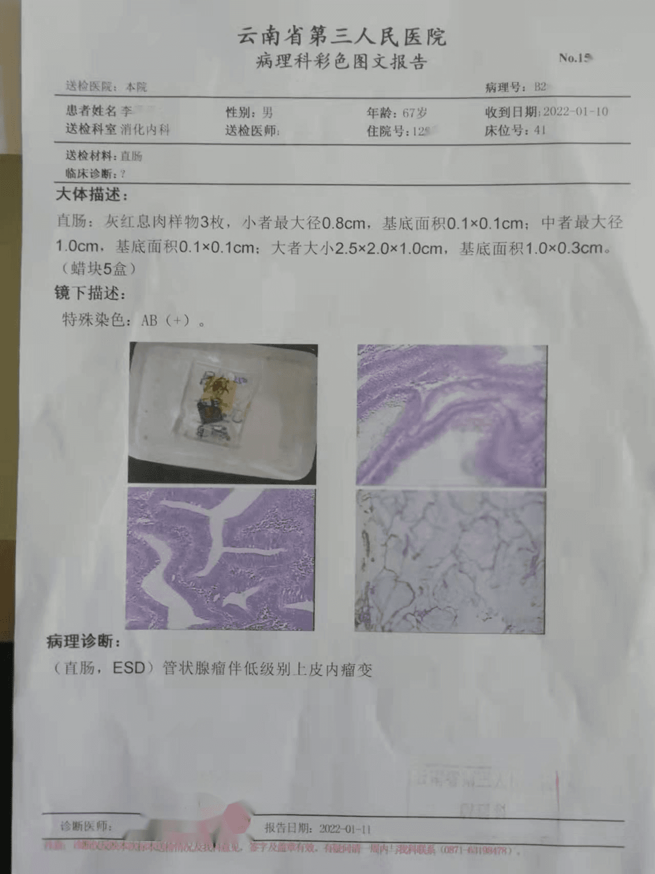 1."回盲部" 示∶管状腺瘤,部分腺体低级别上皮内瘤变(轻-中度异型增生,局部中度异型增生)。