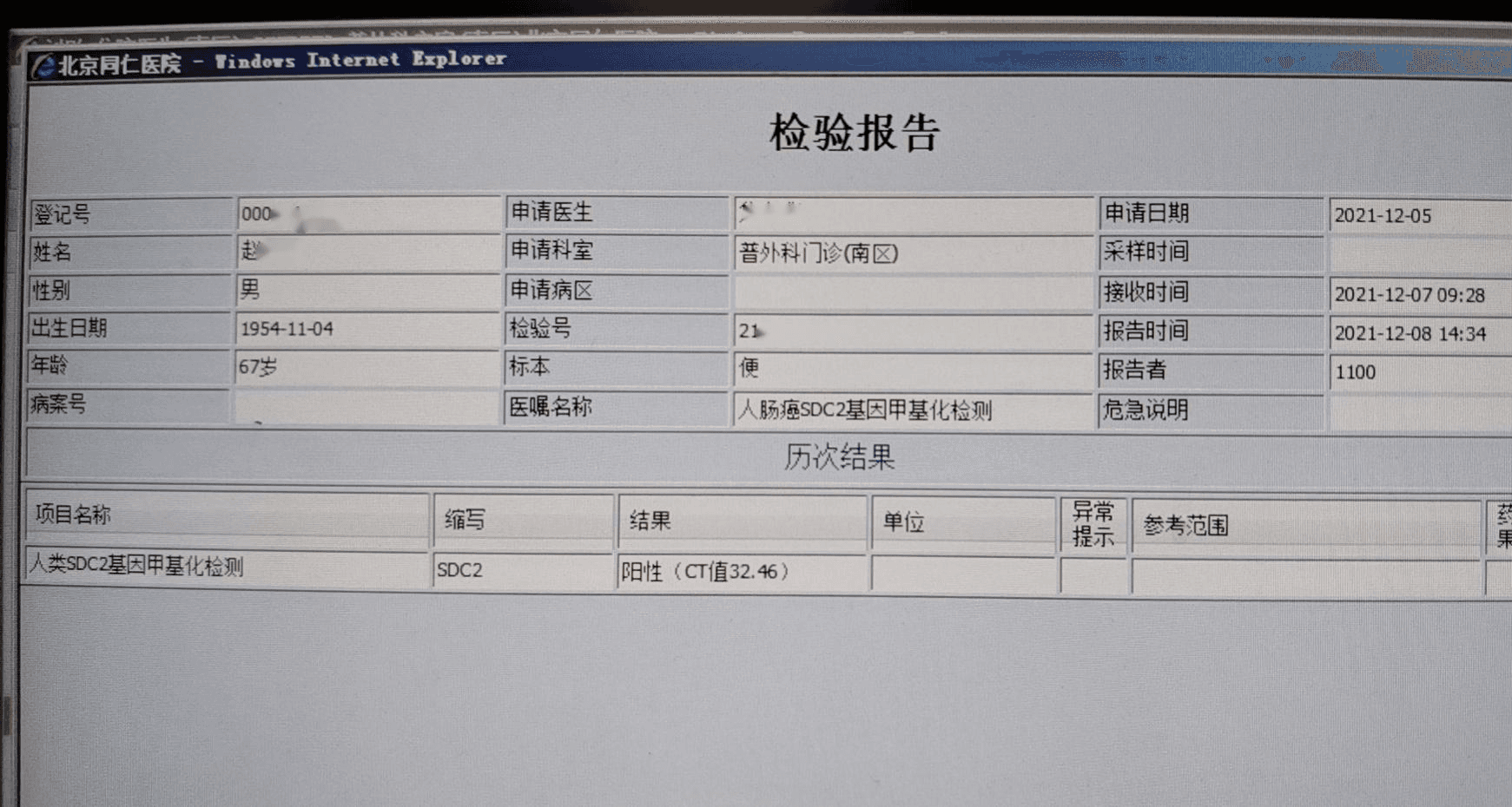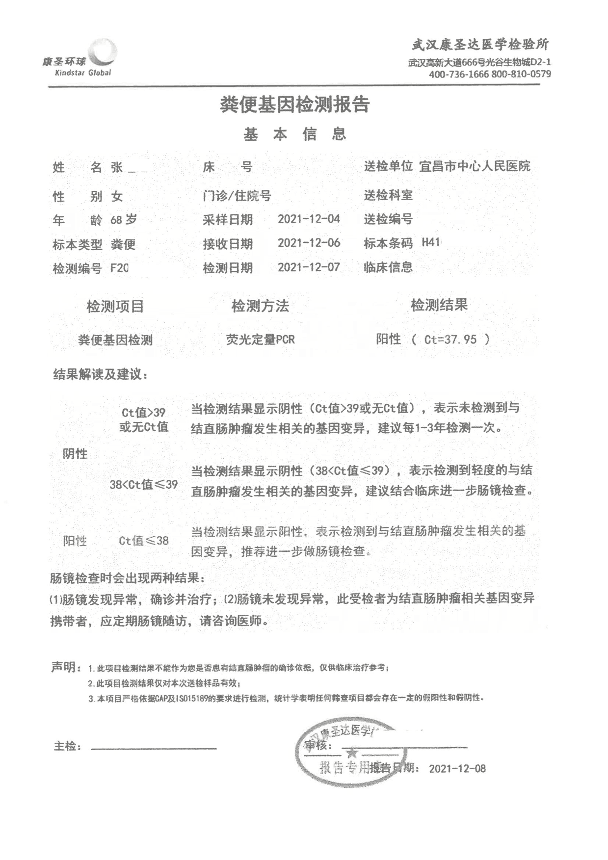 检测时间:2021年12月7日结果:阳性(+);CT值:37.95