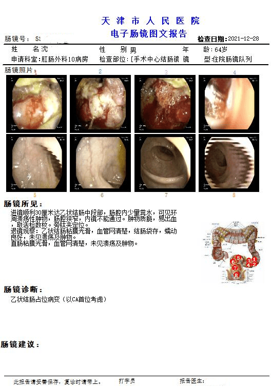 所见:进镜顺利30厘米达乙状结肠中段部,可见环周溃疡性肿物,肠腔狭窄,内镜不能通过。肿物质脆,易出血,取活检数枚。旁钛夹定位。