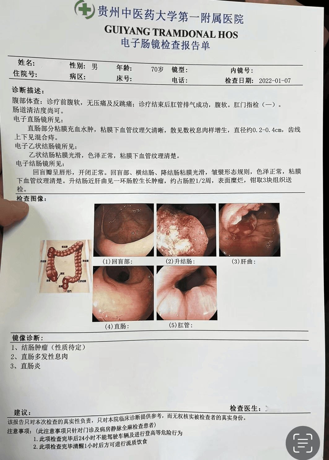 诊断:1、结肠肿瘤(性质待定) 2、直肠多发性息肉 3、直肠炎