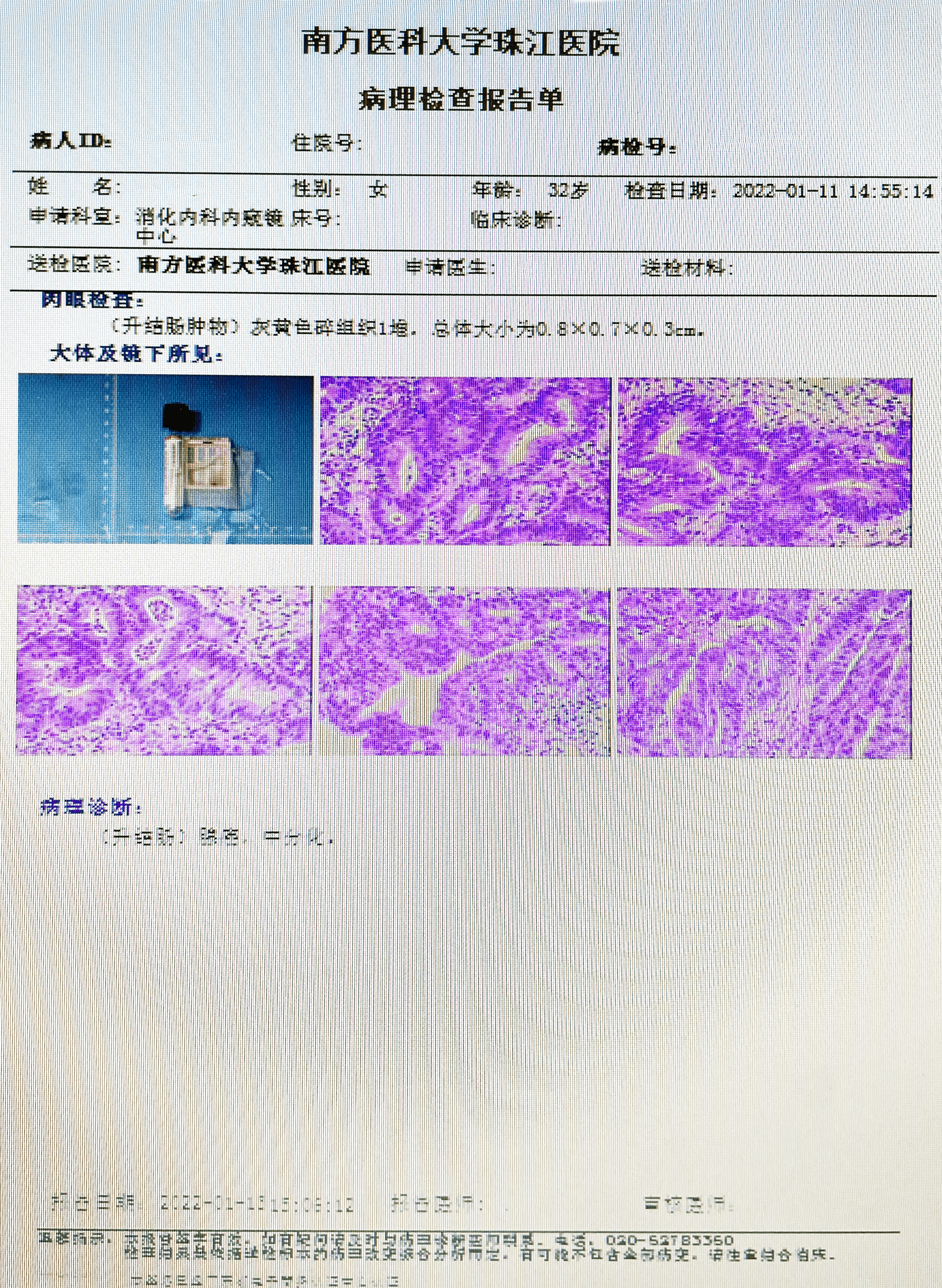 所见:(升结肠肿物)灰黄色碎组织一堆,总体大小为0.8*0.7*0.3cm