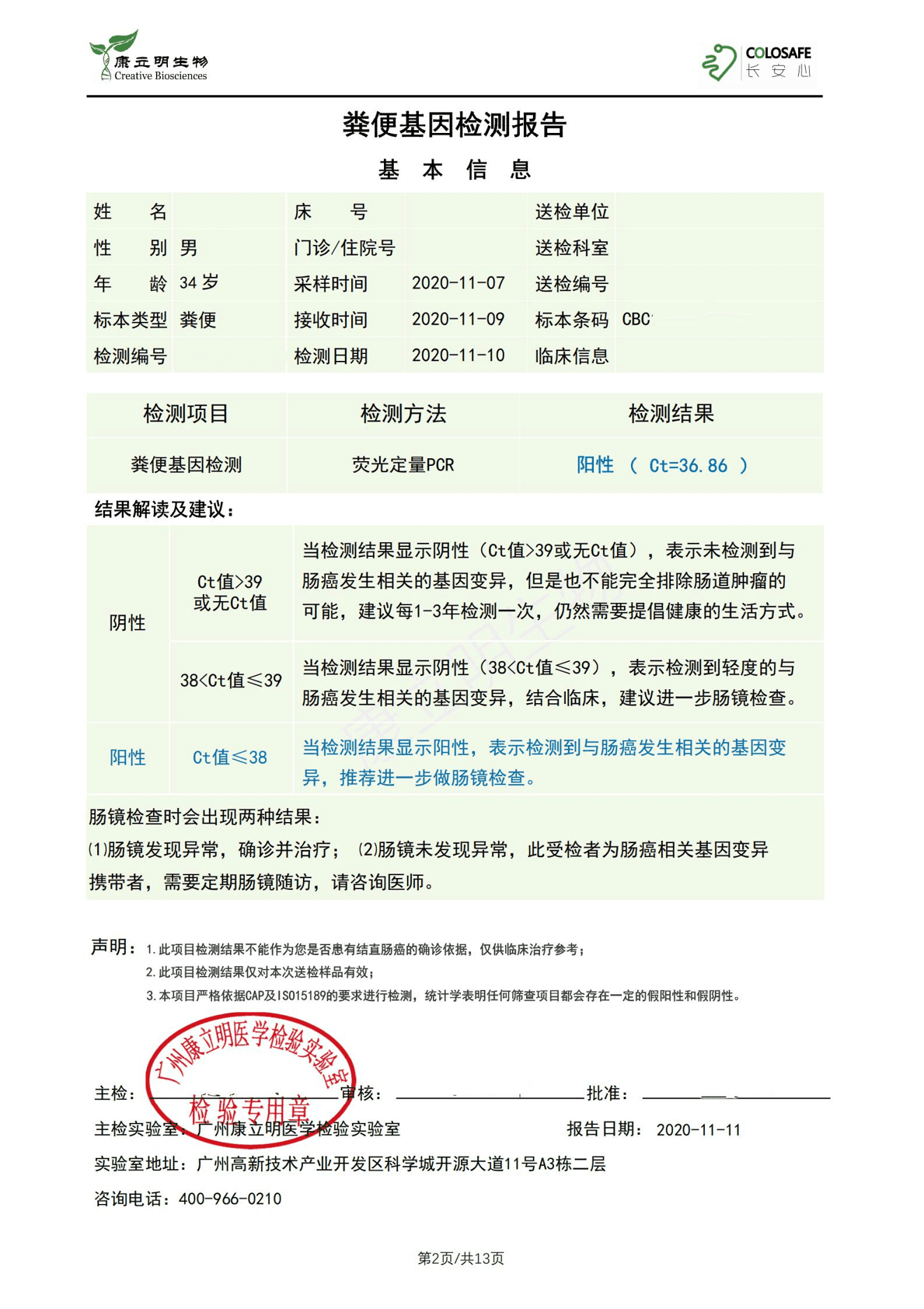 检测时间:2020年11月9日结果:阳性(+);CT值:36.86