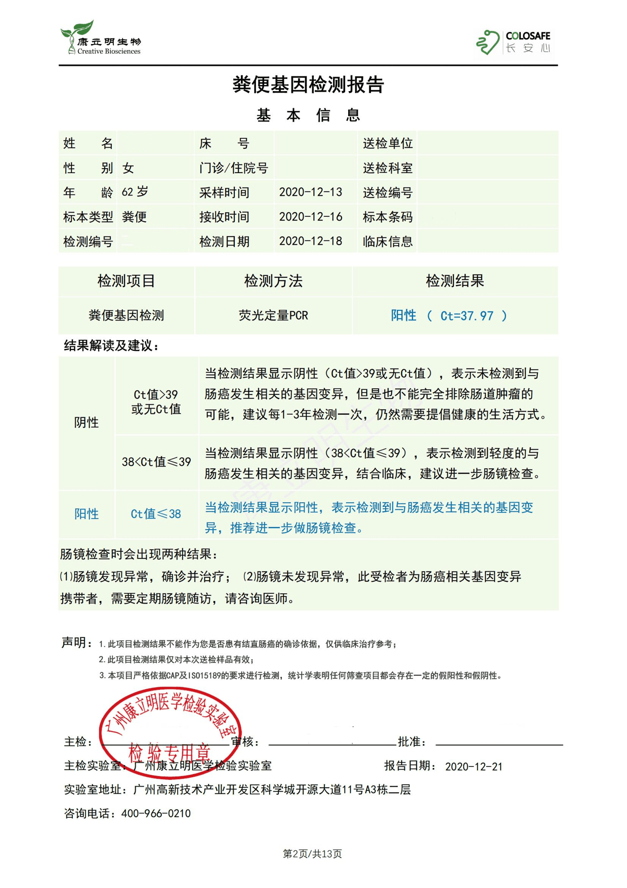 检测时间:2020年12月18日结果:阳性(+);CT值:37.97