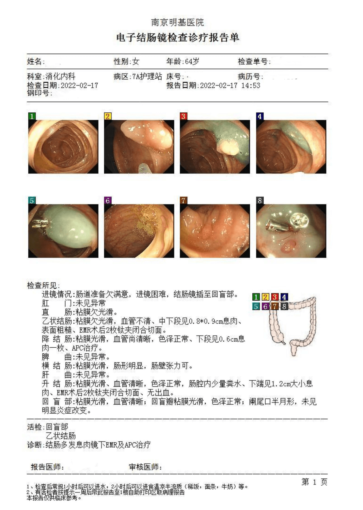 诊断意见:1、结肠多发腺瘤EMR切除术;