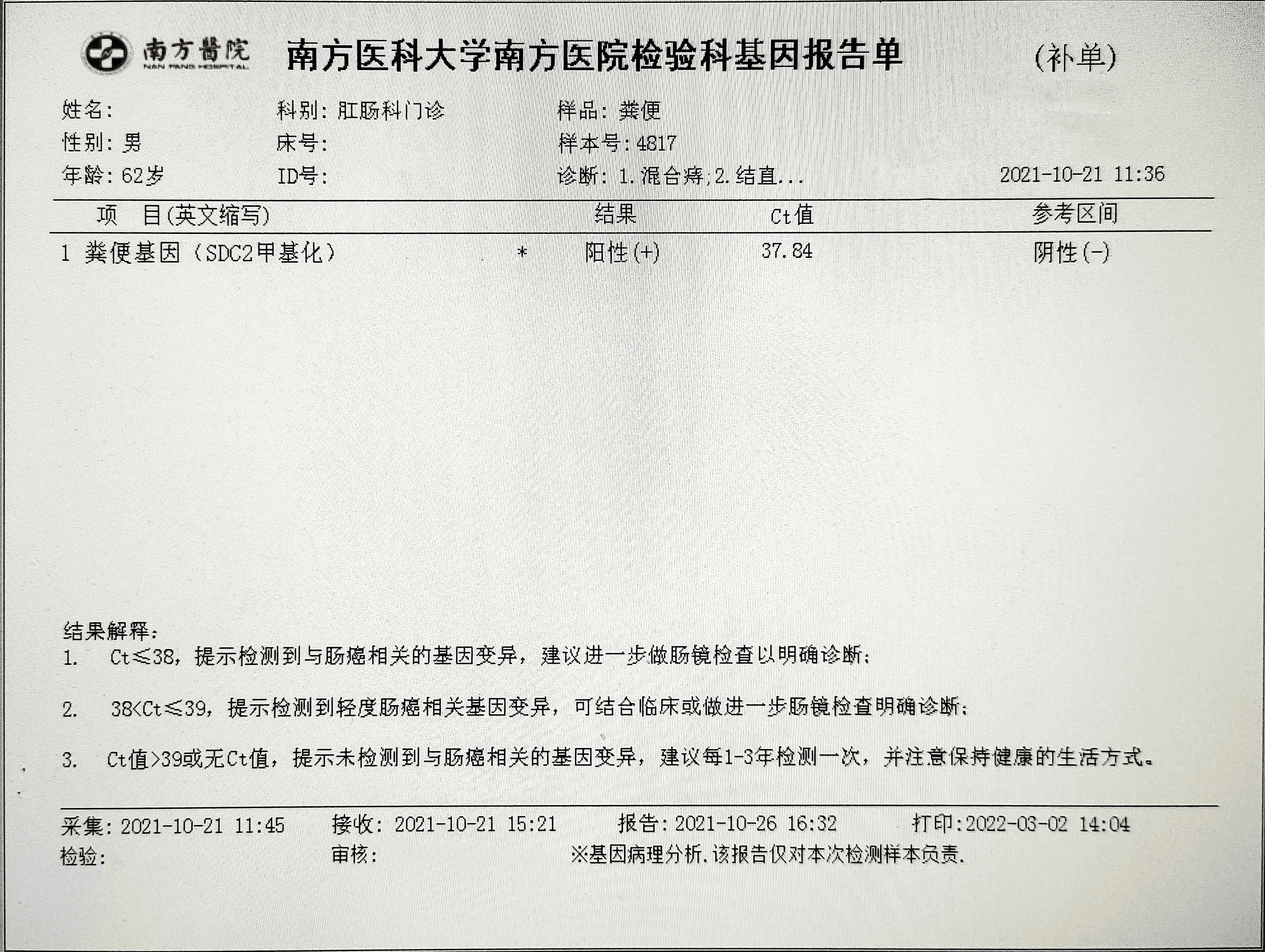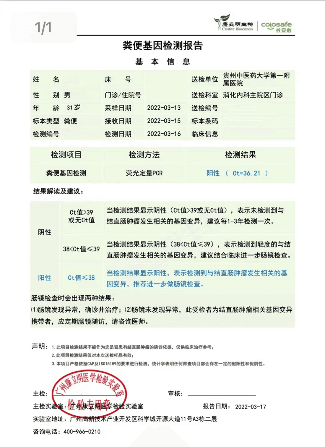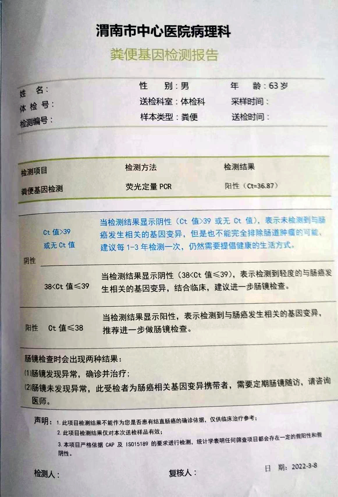 检测时间:2022年3月16日结果:阳性(+);CT值:37.17
