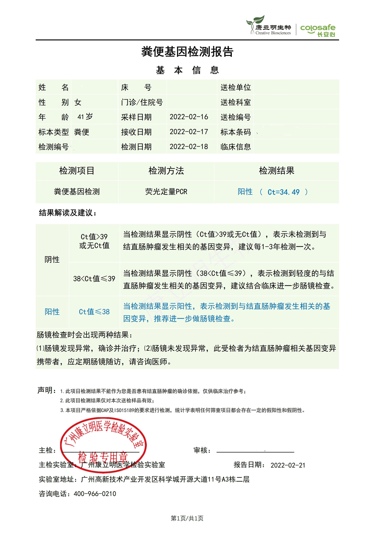 检测时间:2022年7月2日结果:阳性(+);CT值:34.57