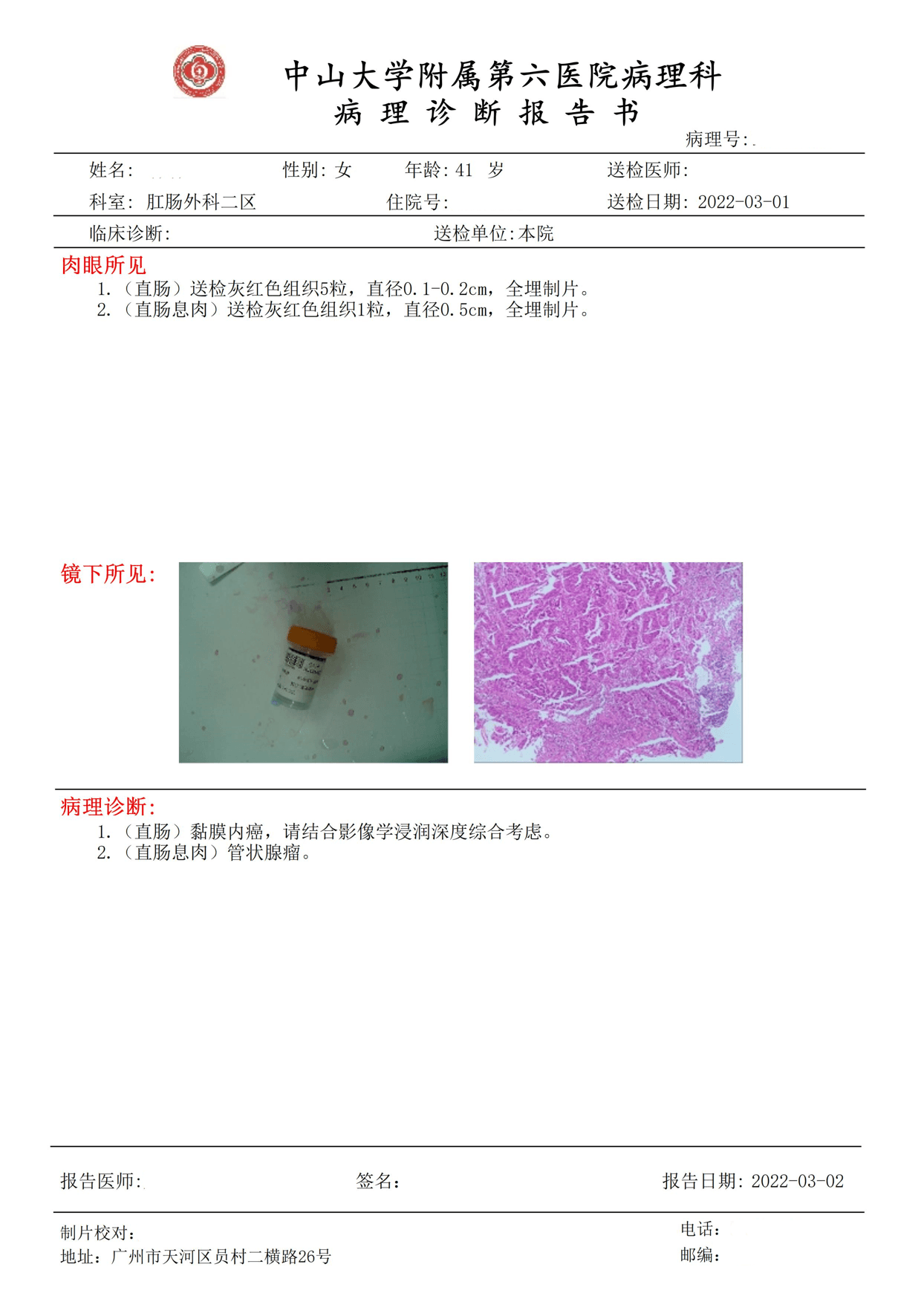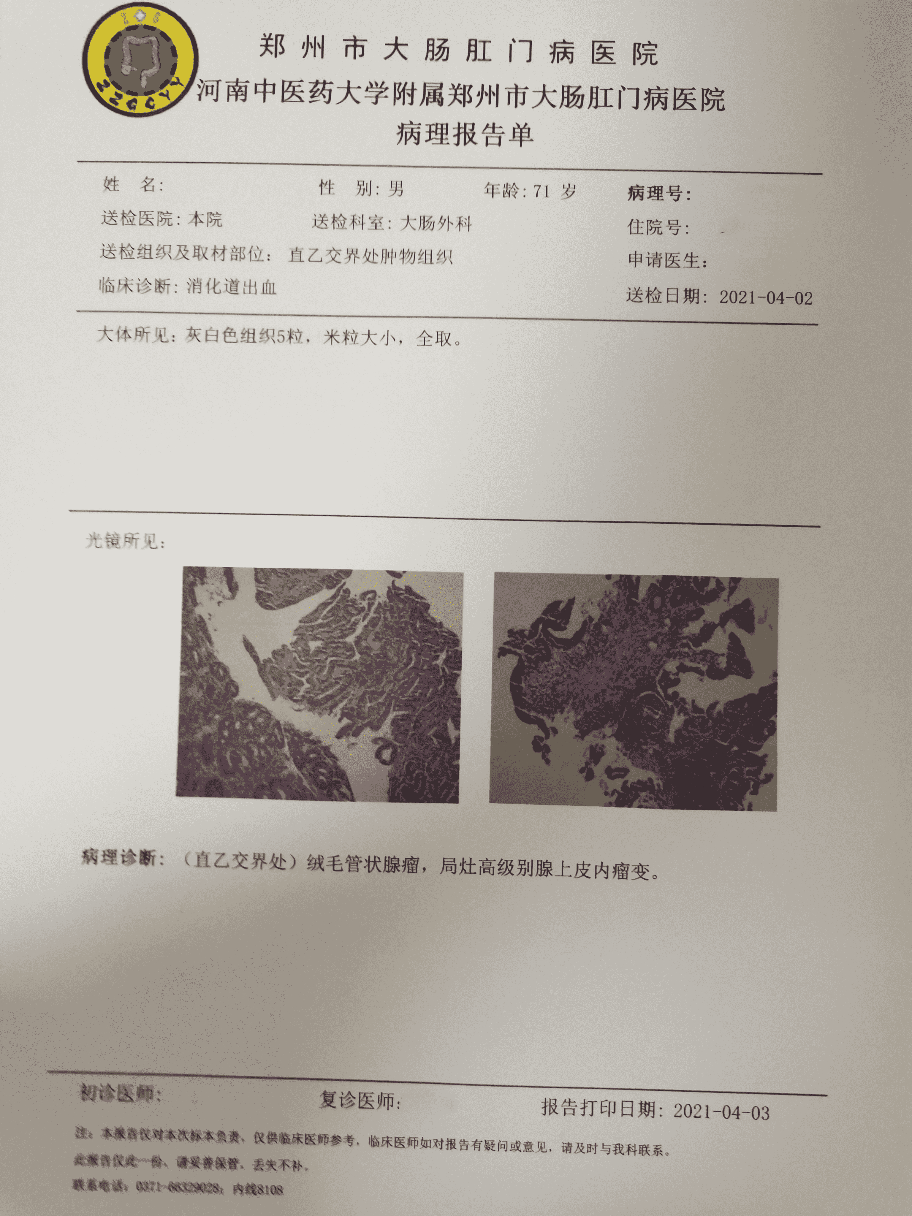 所见:升结肠可见一菜花样肿物,环肠腔约1/2生长,肿物表面糜烂,质脆易出血,取组织送检。肛门可见痔疮。