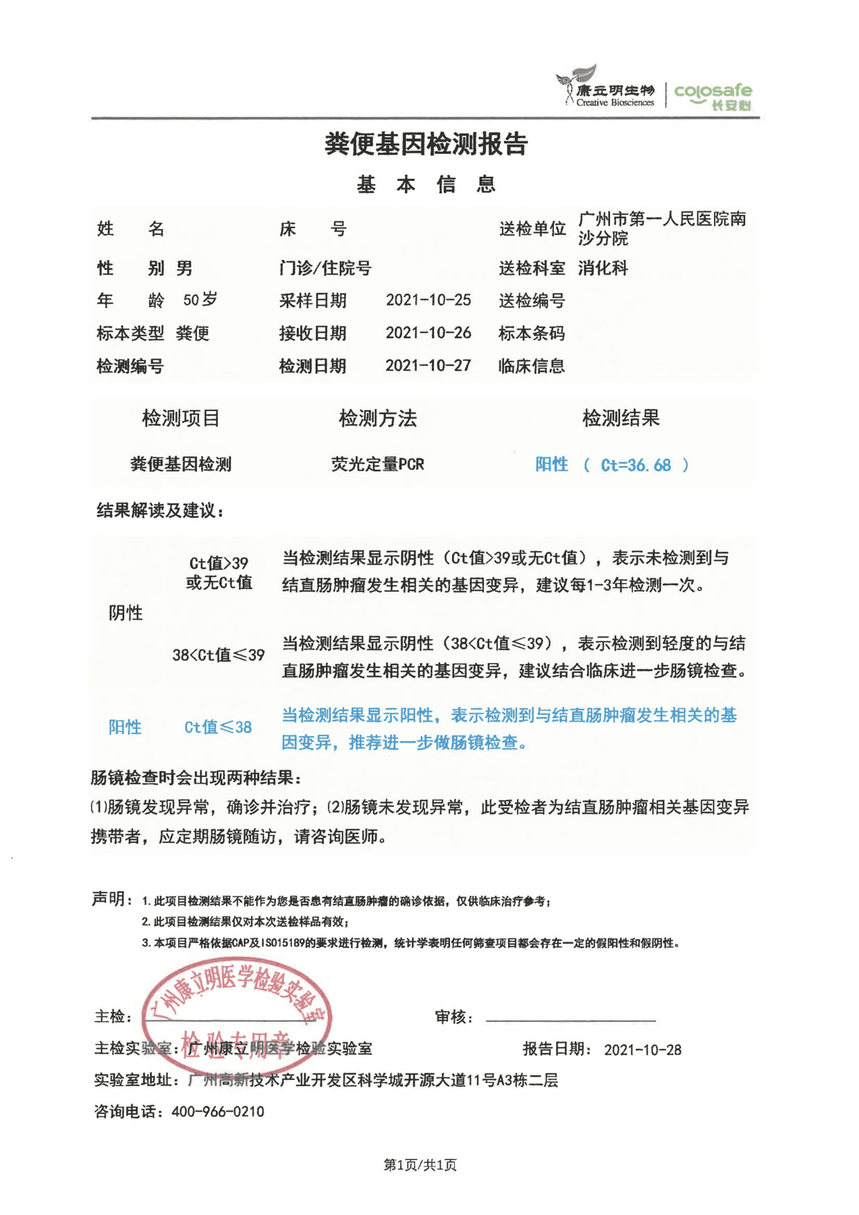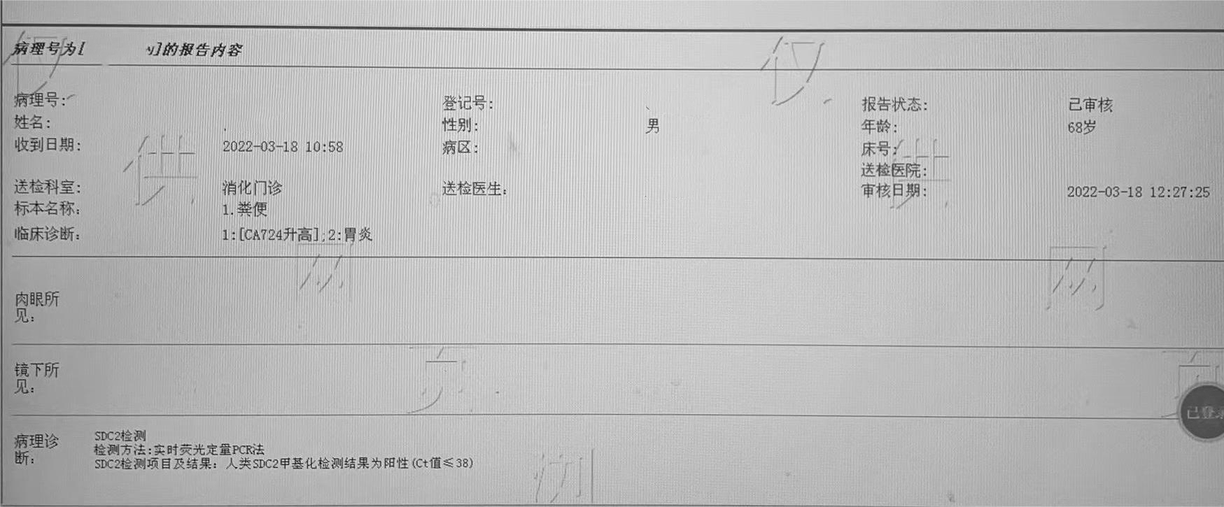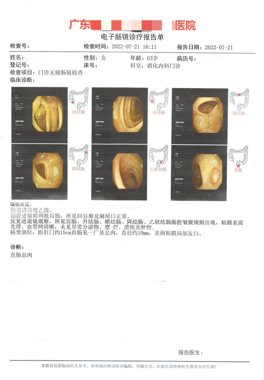 莫女士是一名退休职工,约十年前确诊患有2型糖尿病、胆囊结石、脂肪肝等慢性疾病。在上月中,莫女士在家人安排下到湛江某二甲医院体检中心做健康查体。除了检查了基础体检项目外,体检医生也根据莫女士的身体情况做评估,安排她做了粪便DNA检测,结果【阳性】。得知检测结果后,莫女士与家属都非常重视,随后转到当地某三甲医院消化科就诊,主诊医生了解到阳性结果后便安排莫女士进一步做肠镜检查。