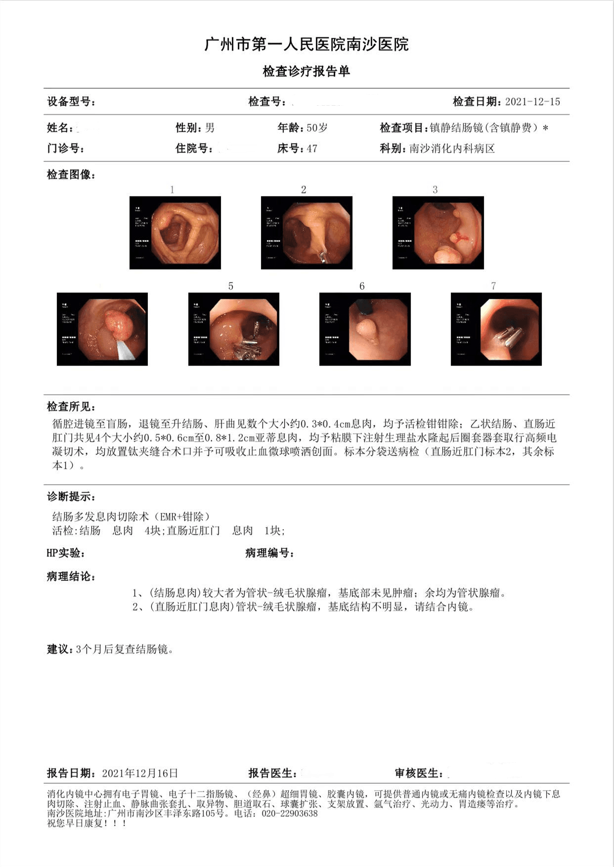 2.(升结肠、肝曲活检、乙状结肠、直肠活检)多发管状腺瘤,建议定期复查;