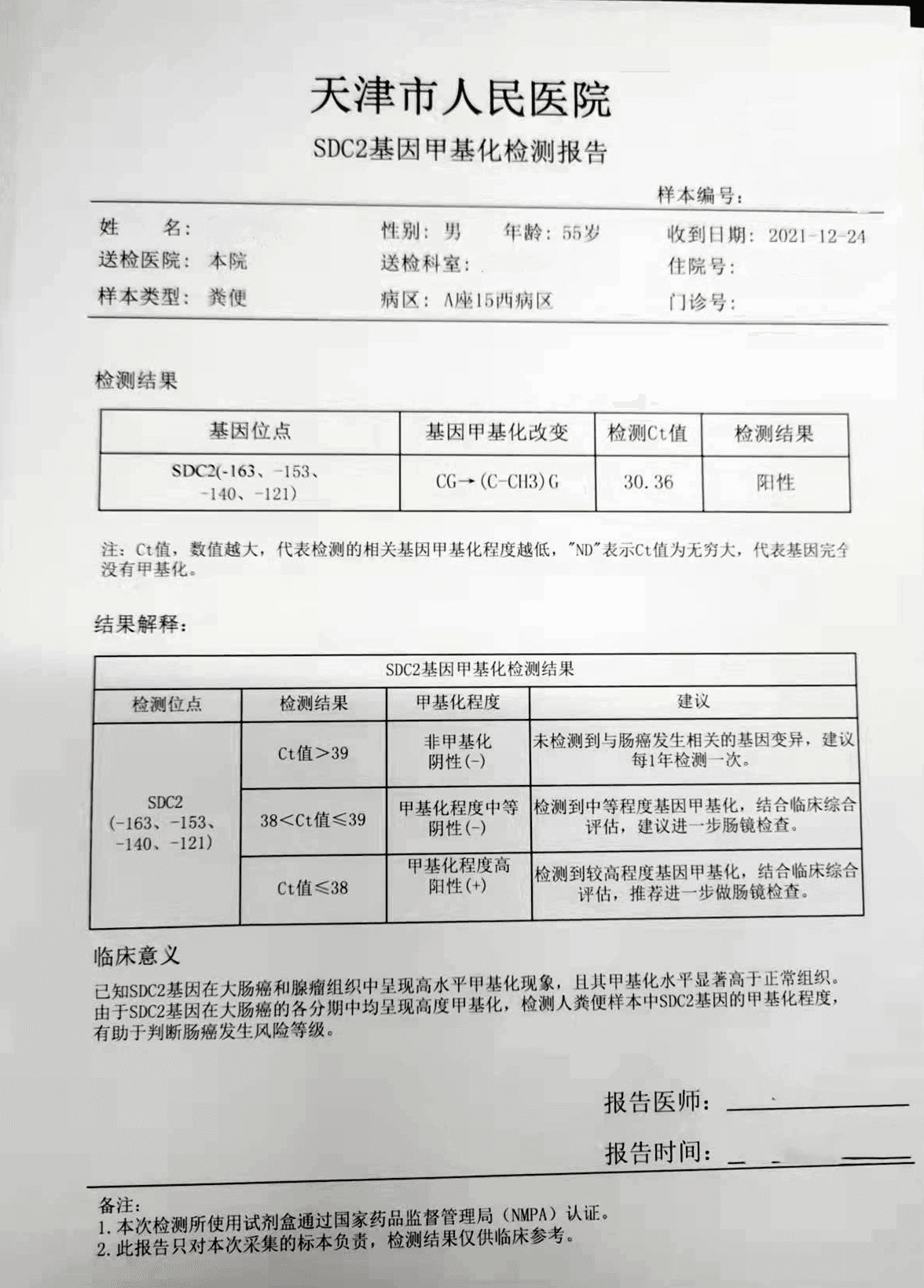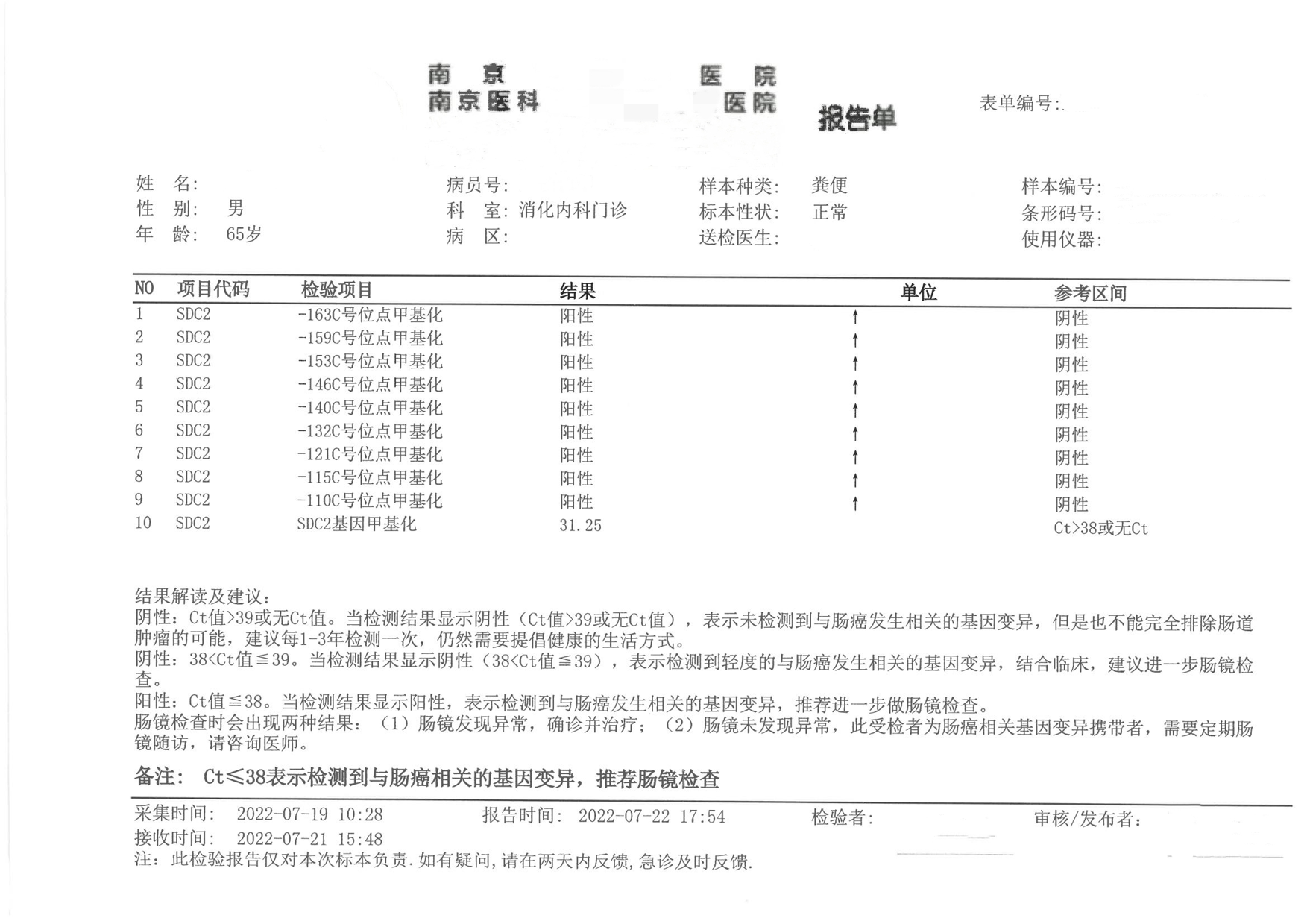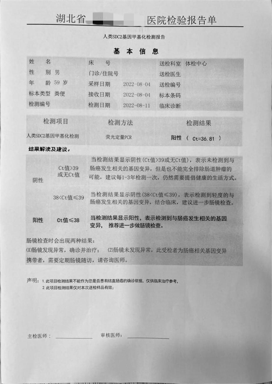 王先生是南京本地的一名退休职工,自一年多前开始出现下腹部不适的症状,自觉消化不良,有间断性腹胀,便秘的情况,因症状较轻,一直也没有引起重视。前段时间王先生腹部不适感加重,到当地三甲医院消化科就诊。因自身患有高血压,医生建议他做了粪便DNA检测,结果【阳性】。医生让王先生通过降压药物稳定控制血压一周后再行肠镜检查。
