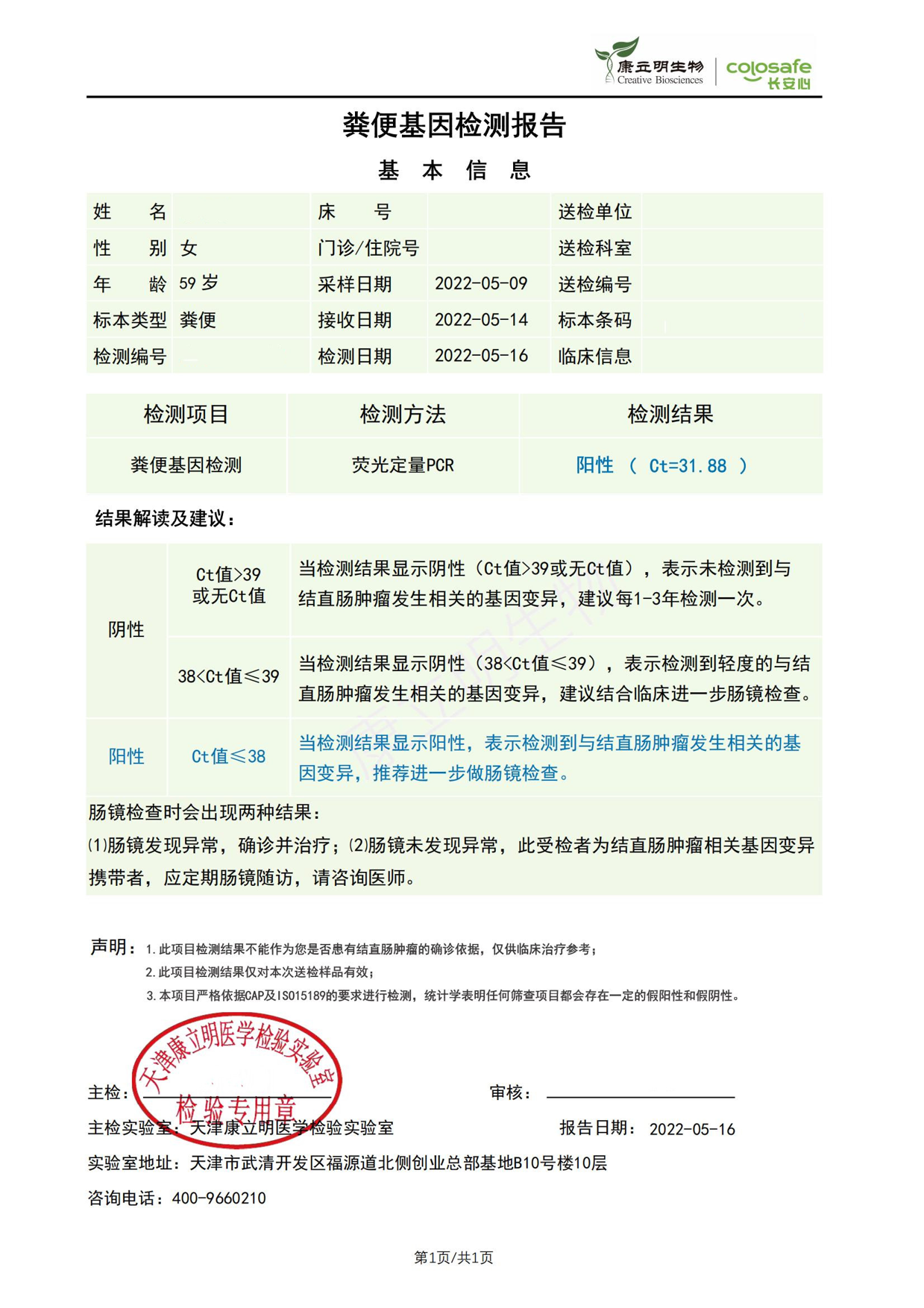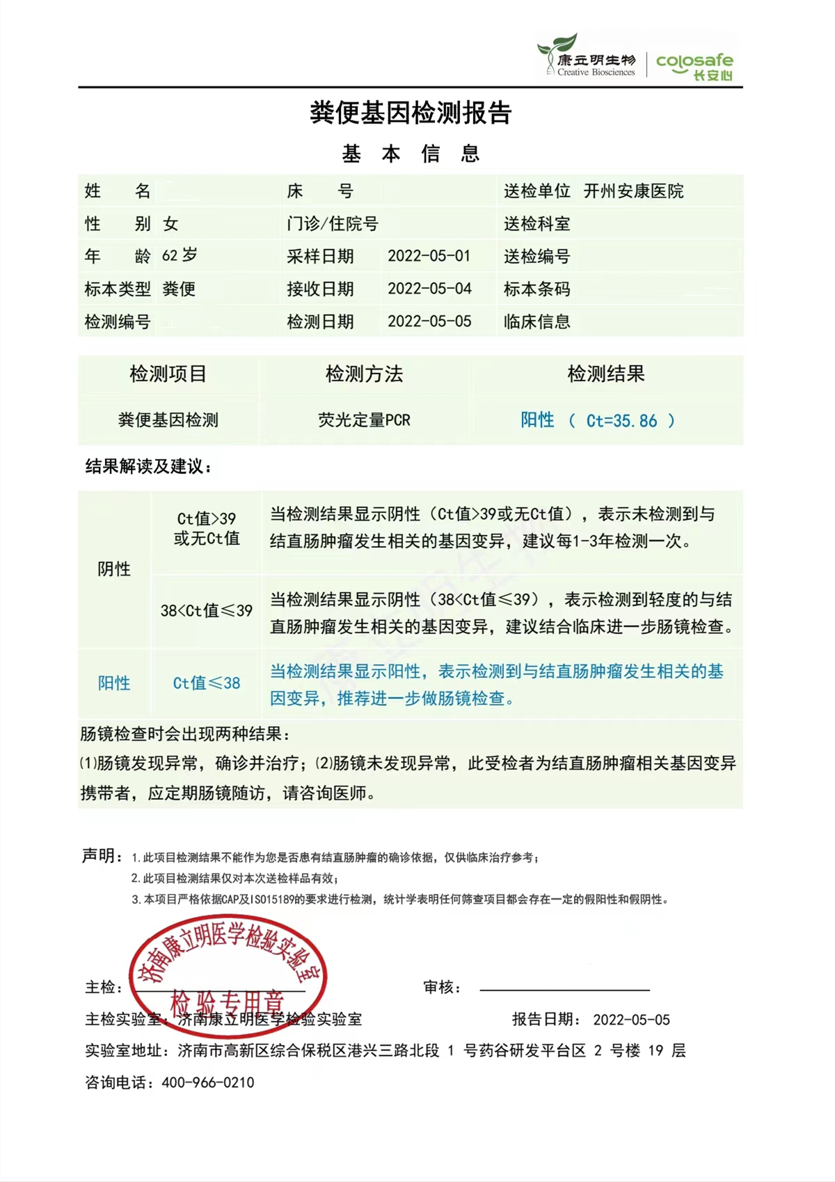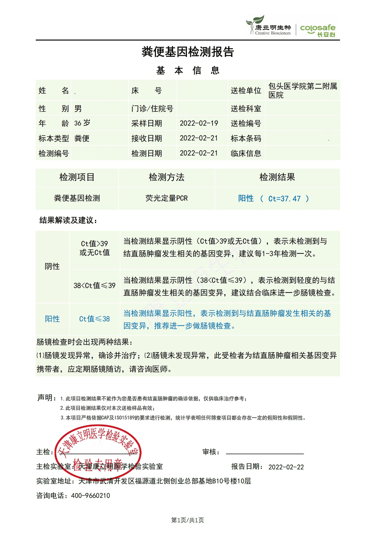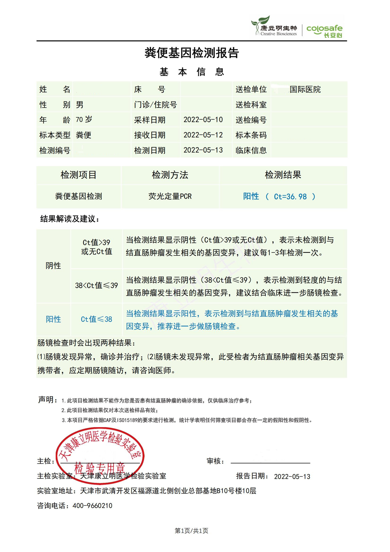 检测时间:2022年5月10日结果:阳性(+);CT值:36.98