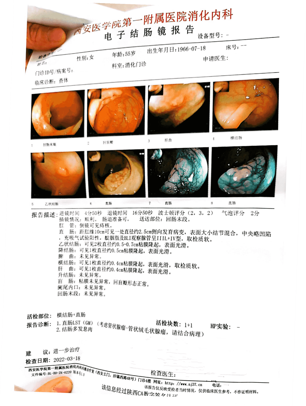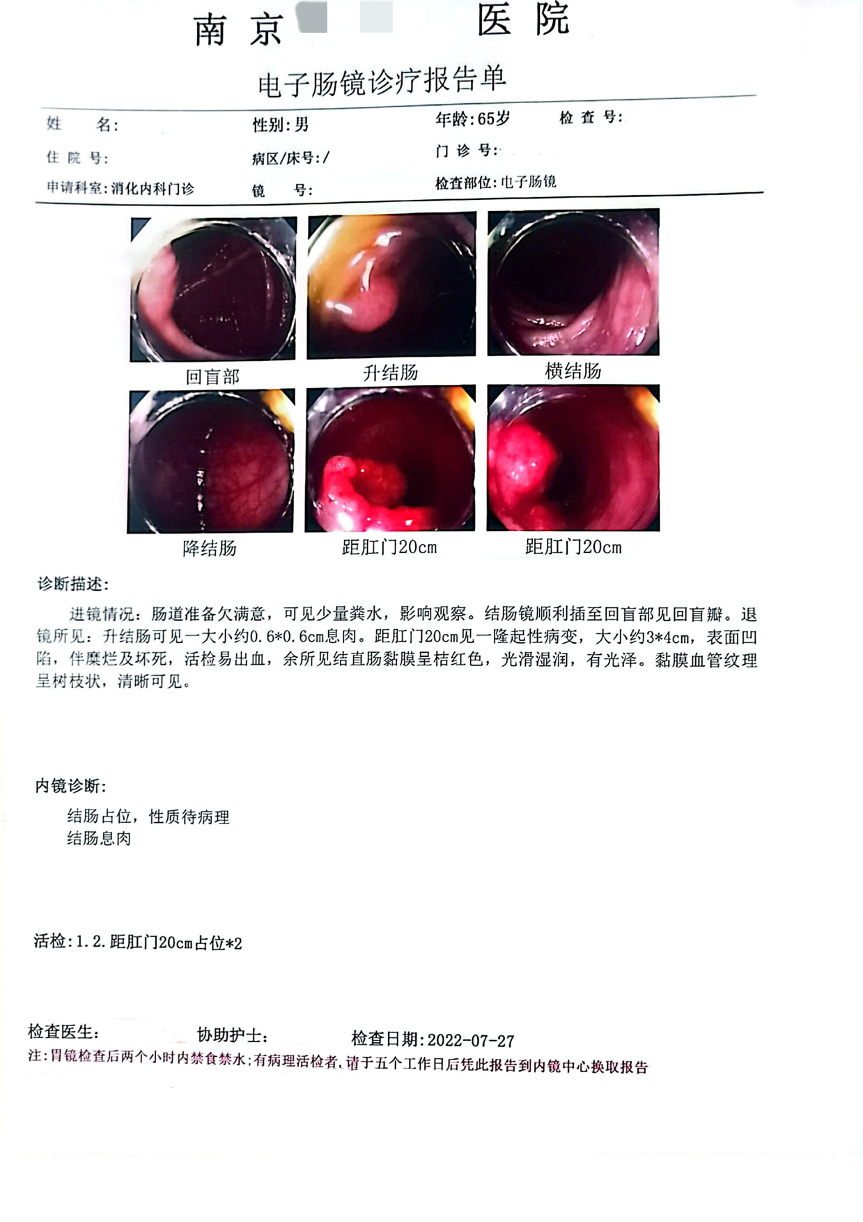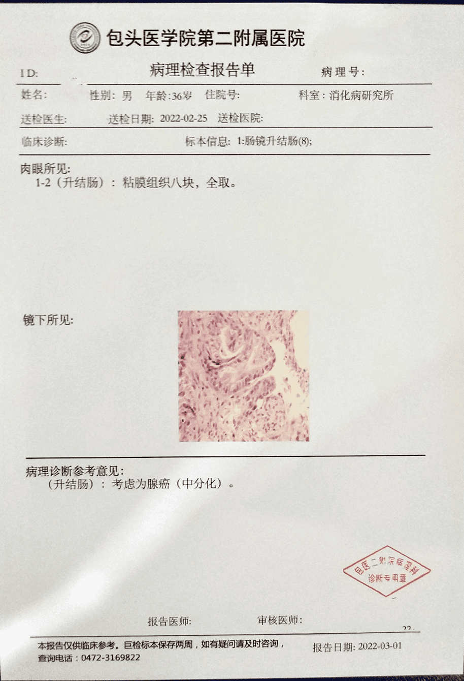 所见:直肠部分粘膜充血水肿,粘膜下血管纹理欠清晰,散见数枚息肉增生,直径约0.2-0.4cm,齿线上下见混合痔。升结肠近肝曲见一环肠腔生长肿瘤,约占肠腔1/2周,表面糜烂,钳取3块组织送检。