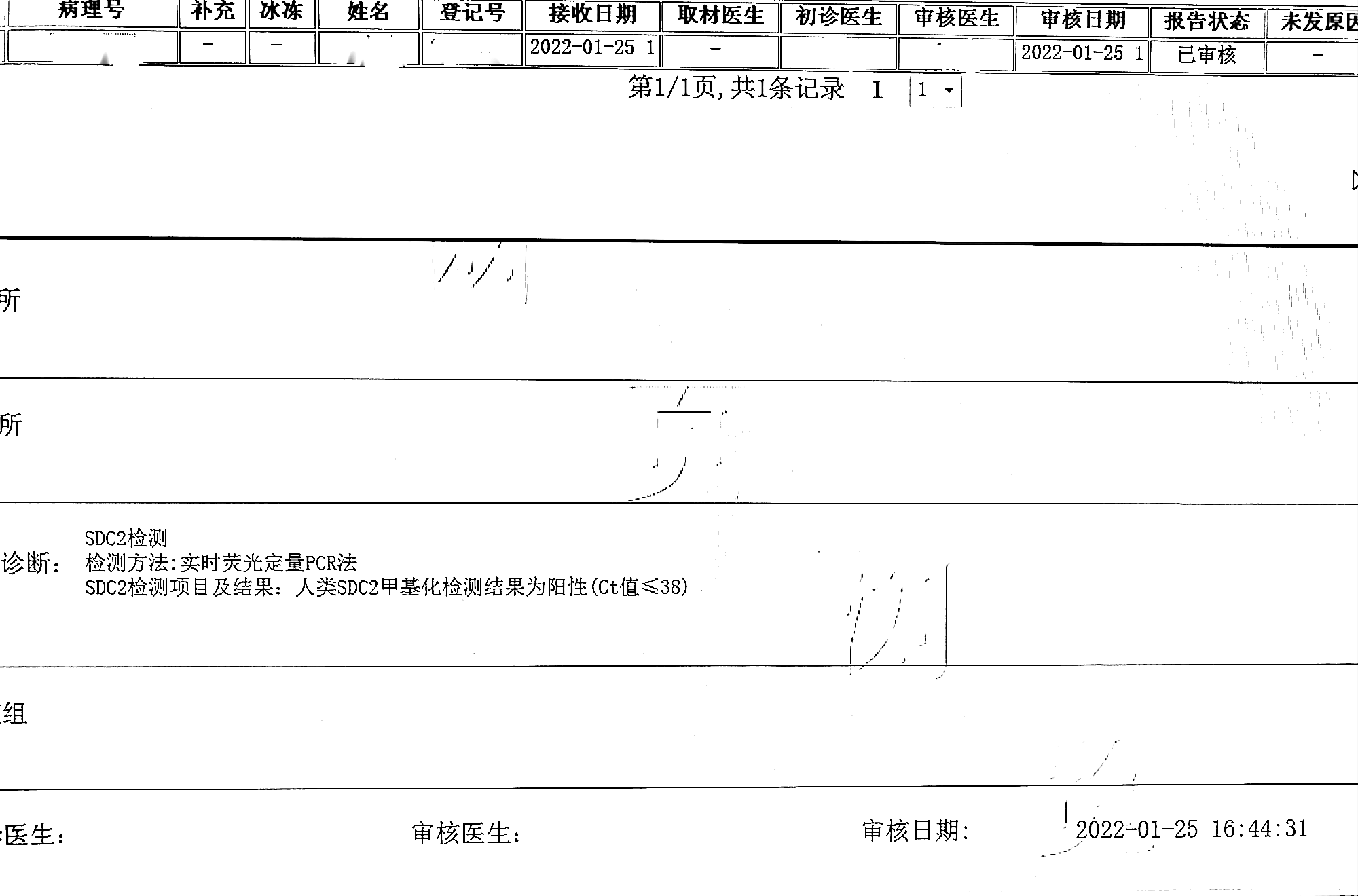 检测时间:2022年1月4日结果:阳性(+);CT值:36.74