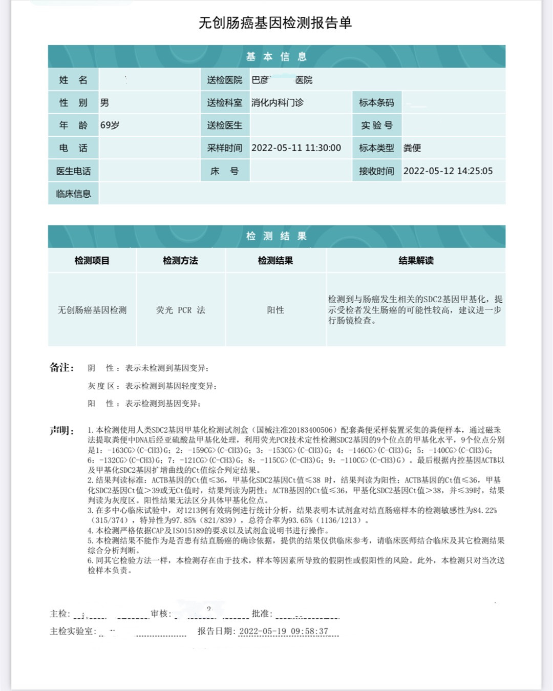刘先生从5年前开始无明显诱因反复出现稀便,在就诊前10天开始出现黑便,自觉下腹部不适,有便意,自觉有反酸、嗳气、排气增多的症状。刘先生告诉医生十余年前曾做过阑尾炎手术,约十年前就确诊患有冠心病及高血压,在两年前做了主动脉瓣置换术,目前有在长期服用华法林以及降压药物。因刘先生慢性病症较为复杂, 经医生评估后便让刘先生做了更安全、无创的粪便DNA检测;结果【阳性】,刘先生看到结果,听取了医生的建议,暂时停服华法林一周再行肠镜检查。
