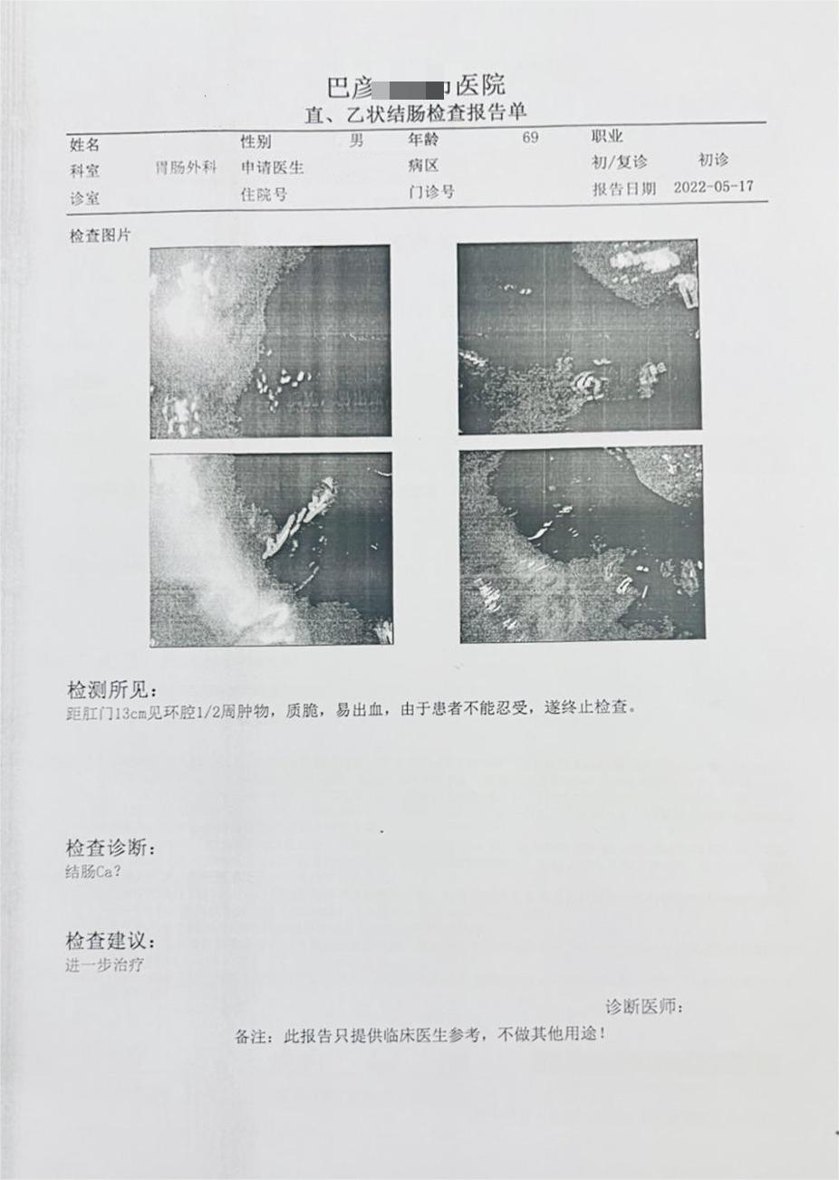 胡先生大便形状改变4余年,但自觉肠道无明显不适,一直也未做过肠镜检查。今年8月主动到医院要求做全面检查,一开始医生要求其行肠镜检查,但是胡先生很抗拒,不愿意做肠镜,于是医生安排粪便DNA检测,结果显示【阳性】,胡先生家属考虑到他年龄大,以往有基础病,为安全起见最后胡先生到三甲医院住院做肠镜并完善其他检查。