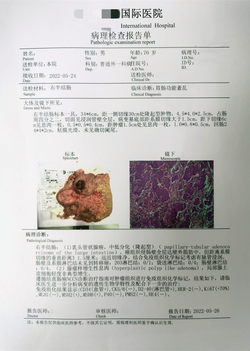 诊断:(右半结肠)中分化腺癌,癌组织侵及肠壁浆膜下层,肠周淋巴结9枚,0/9见癌转移。