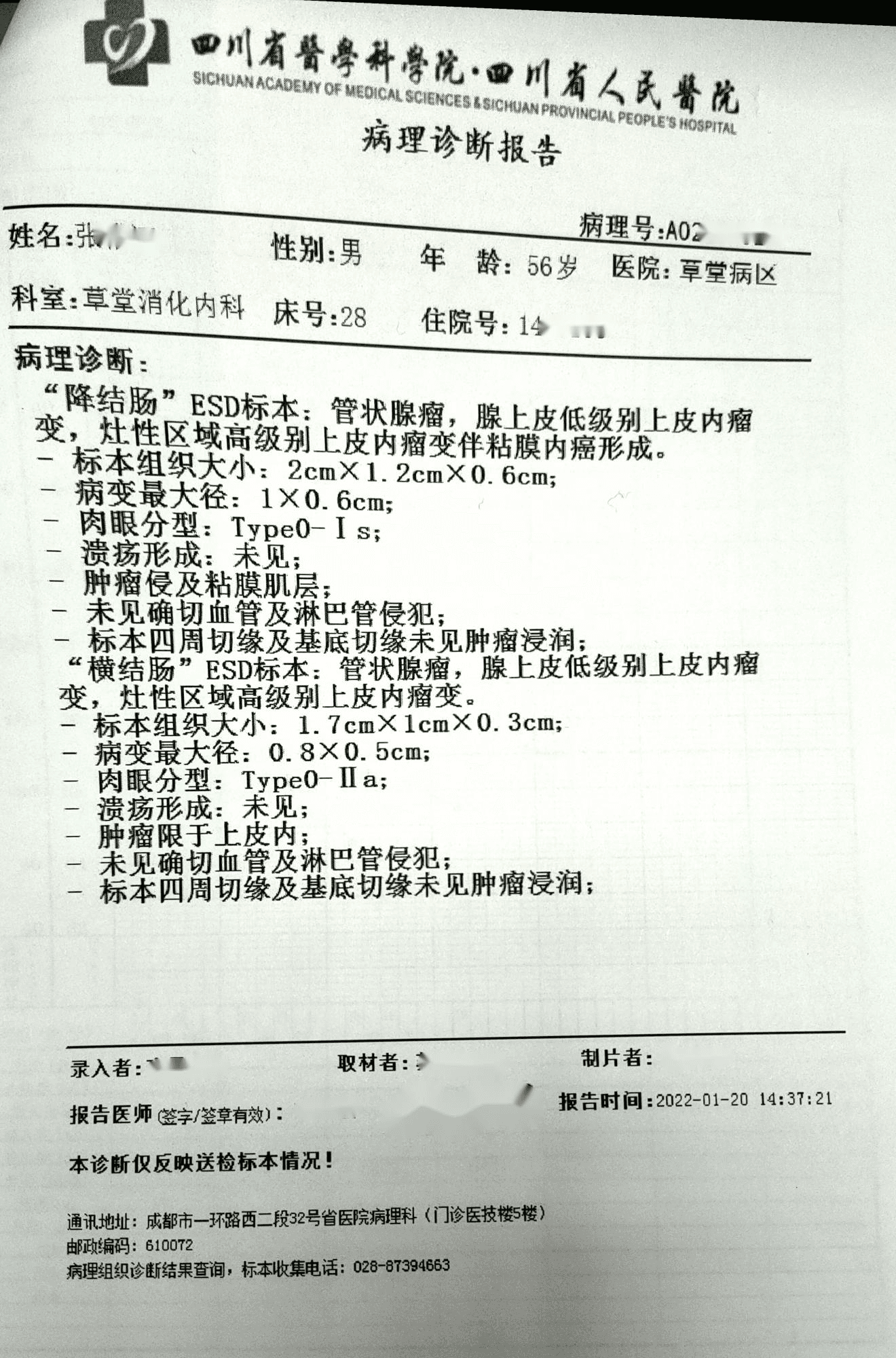 1、“降结肠”ESD标本:管状腺瘤,腺上皮低级别上皮内瘤变,灶性区域高级别上皮内瘤变伴粘膜内癌形成。