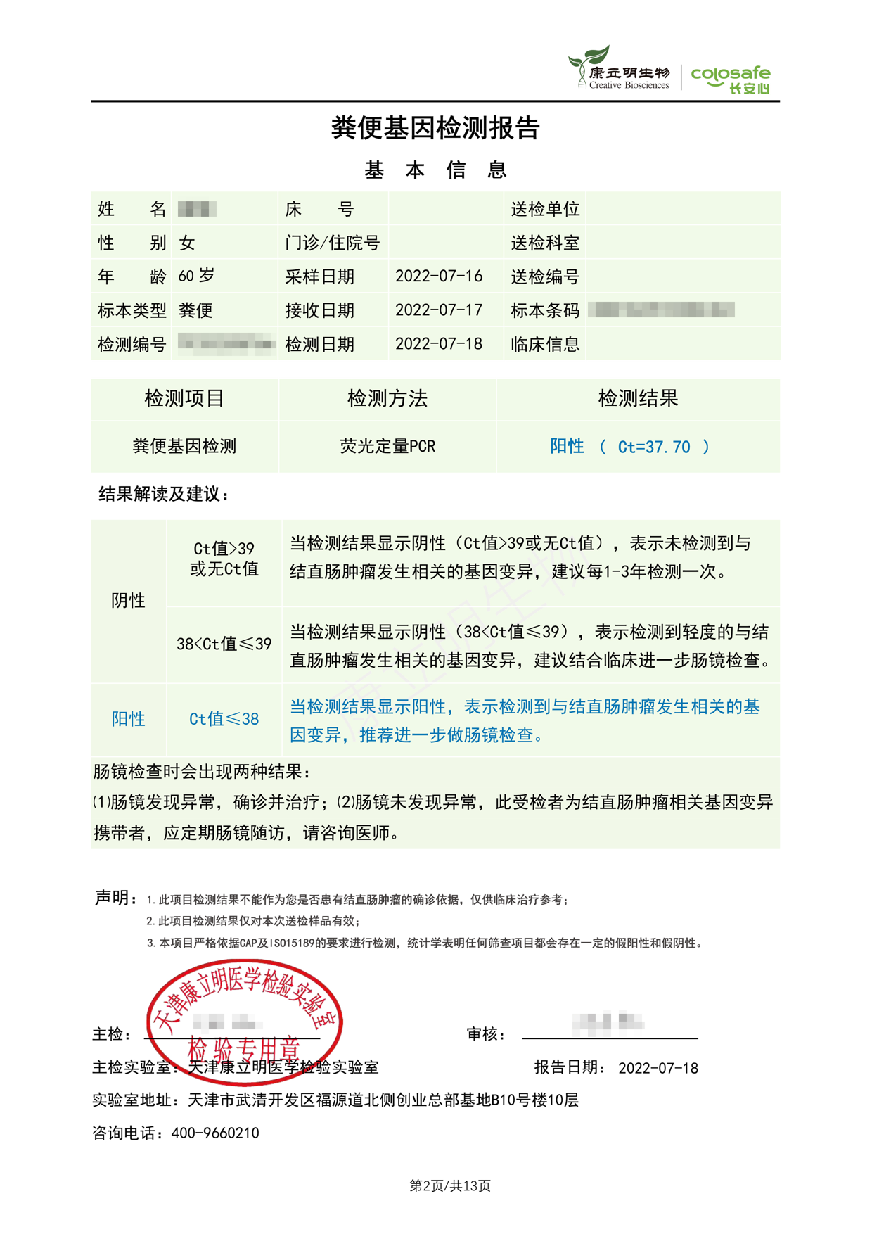 检测时间:2022年7月16日结果:阳性(+);CT值:37.70