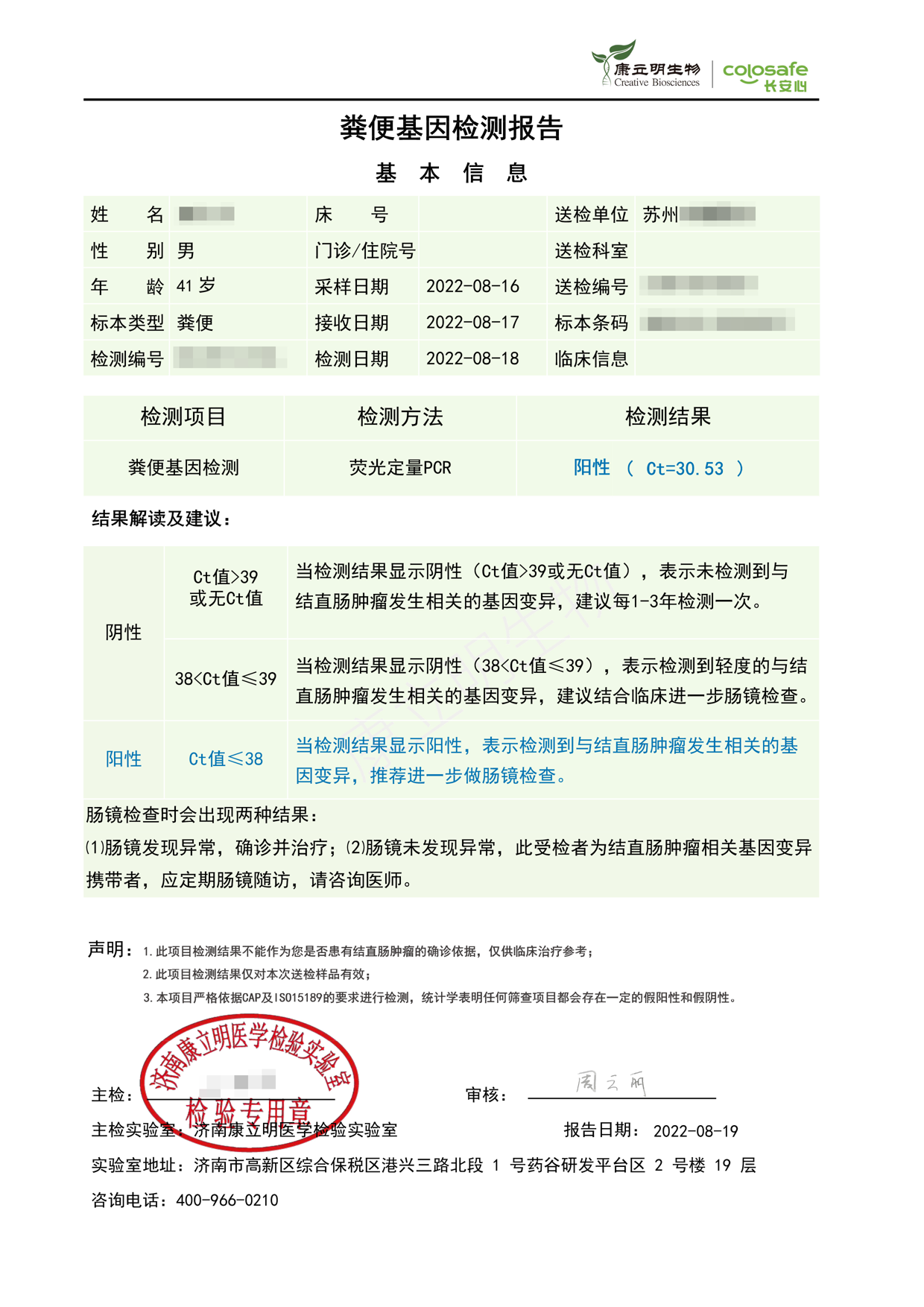 检测时间:2022年8月16日结果:阳性(+);CT值:30.53