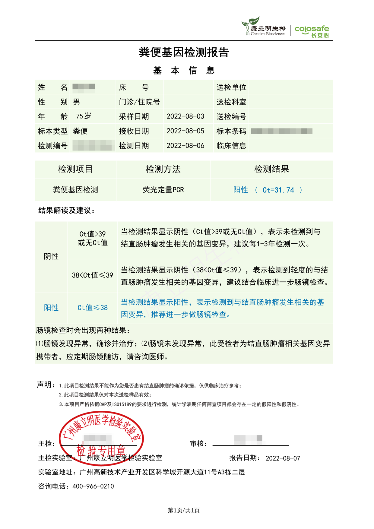 检测时间:2022年8月3日结果:阳性(+);CT值:31.74