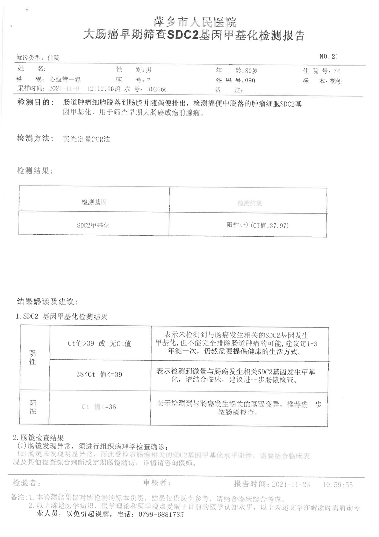 检测时间:2021年11月9日结果:阳性(+);CT值:37.97